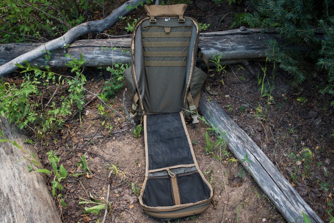 Opening the main zipper down to the upper compression straps results in access as seen above. There is the signature Chamber pocket at the rear sitting over a PALS field, a hanger loop for a hydration bladder (though no port for the hose) and a mesh pocket on the front panel. Given the orientation of the zipper, Kifaru must intend the pocket to be accessed with the panel folded out as seen here.