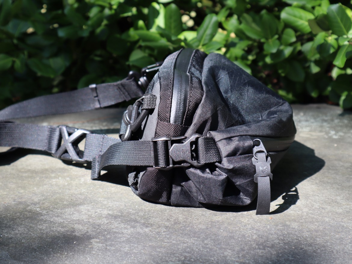The strap is one inch in width, thiner than the one on the X-Pod but it is more than adequate for this smaller bag. The strap locks in a through-the-buckle fashion, like a normal belt or like a messenger bag. I normally prefer a loop back system where I can pull with one hand from one end to shorten the strap. There is a pull tab at the adjustment point to let you quickly loosen the strap once you have some practice. It’s a little small, so I found that hooking a #3 S-Biner onto the tab makes manipulation easier.