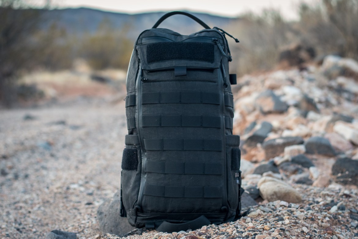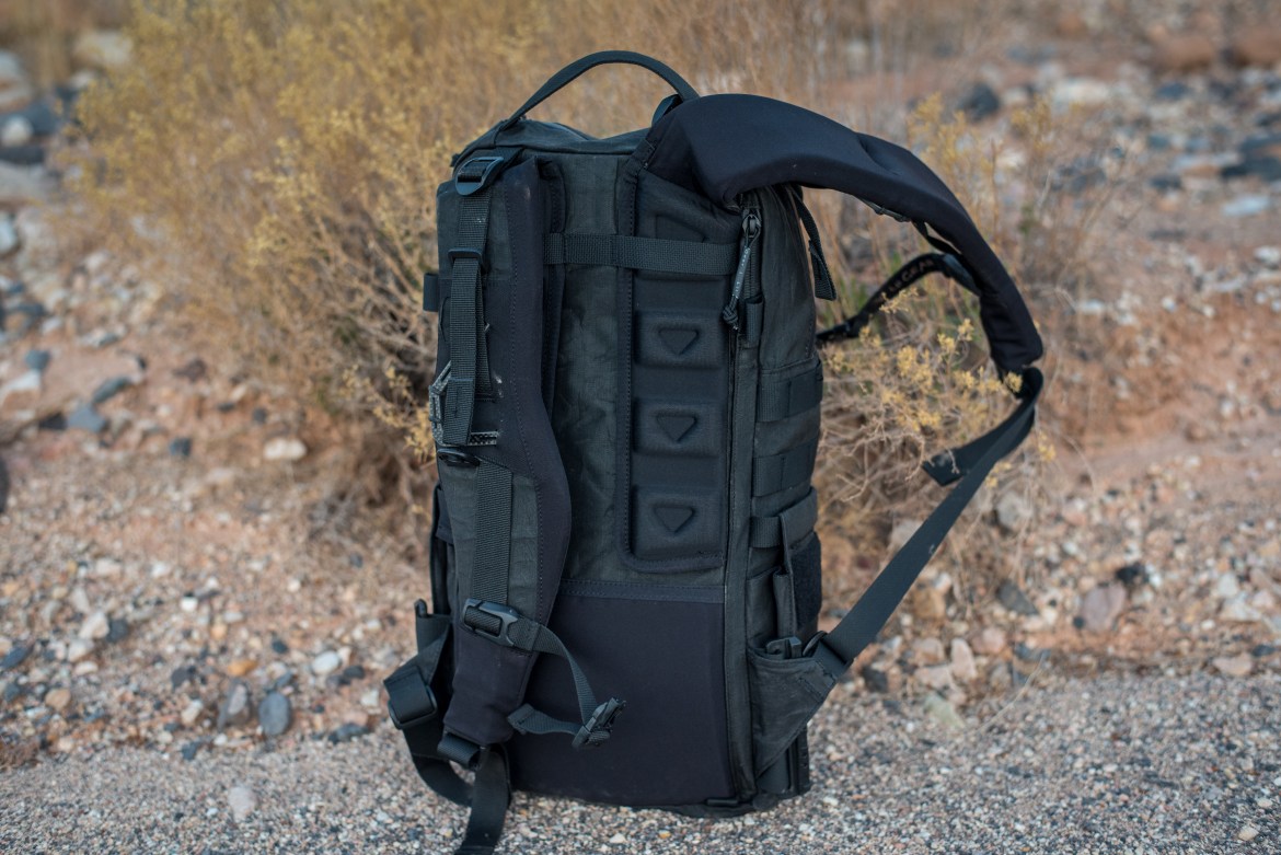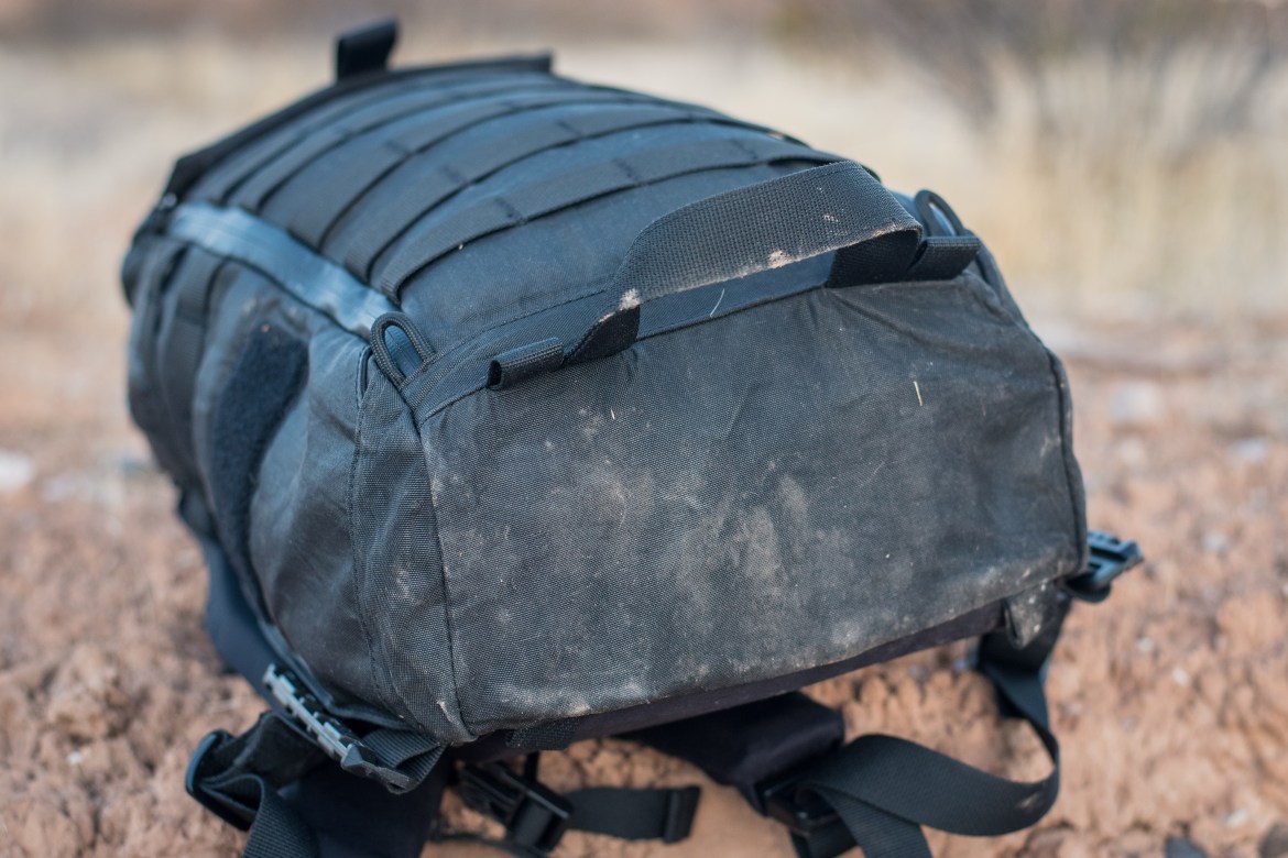 The bottom on the pack is mostly slick, save four lower attachment tabs and the grab handle. There are paracord counter zipper pulls that can be seen from this angle as well.