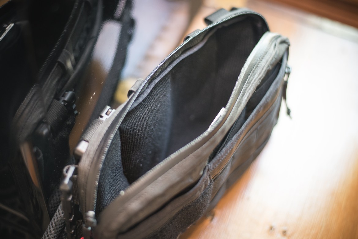 Mr. Control likely gleans it name from the numerous built in organizational options. There are pockets and elastic loops throughout the bag. The face of the bag features a loop patch panel, two open top pockets with elastic loop inside, a zipper pocket that fits a minimalist wallet (though none of these will fit my iPhone XS). There is also a small area of PALS-type webbing. Atop the bag is a pair of elastic loops that seem designed for securing a pen. Each side of the sling feature paracord counter pulls to aide in opening/closing the bag.
