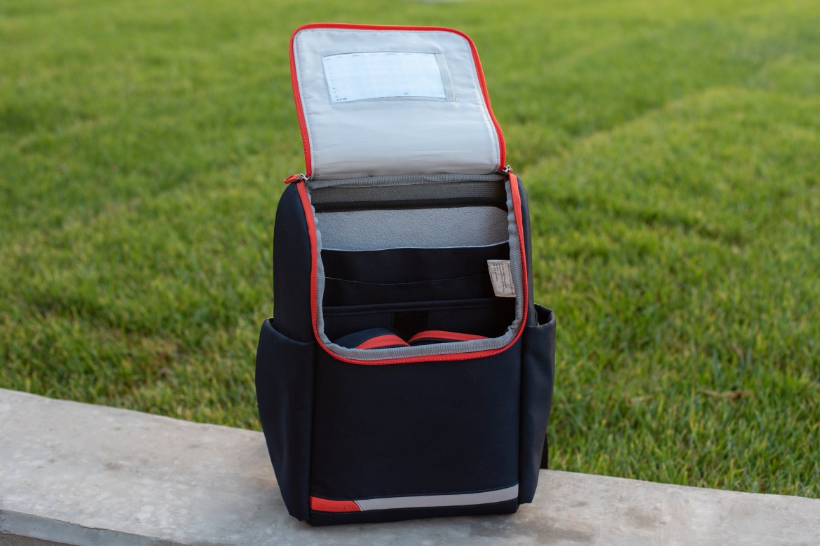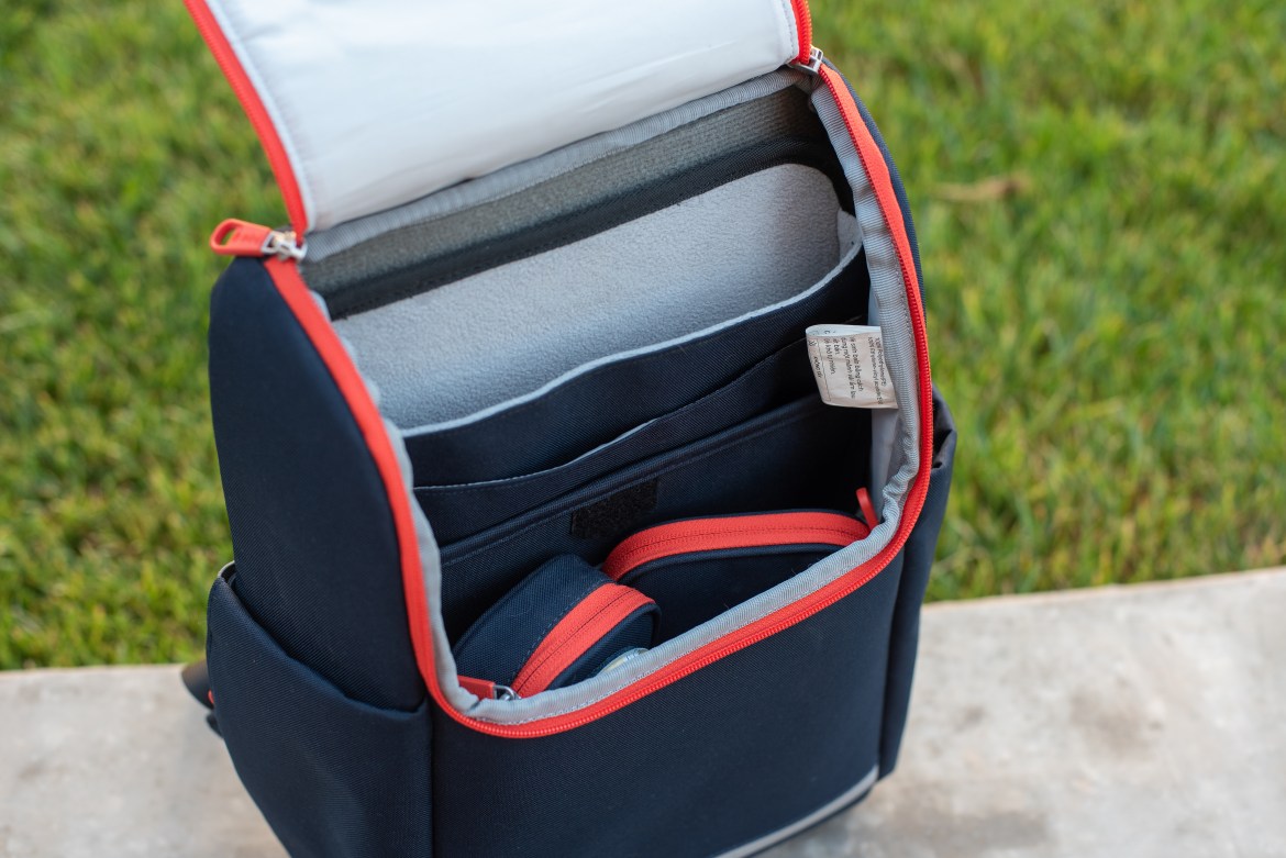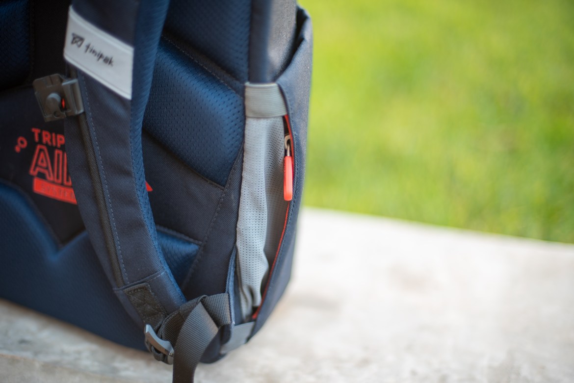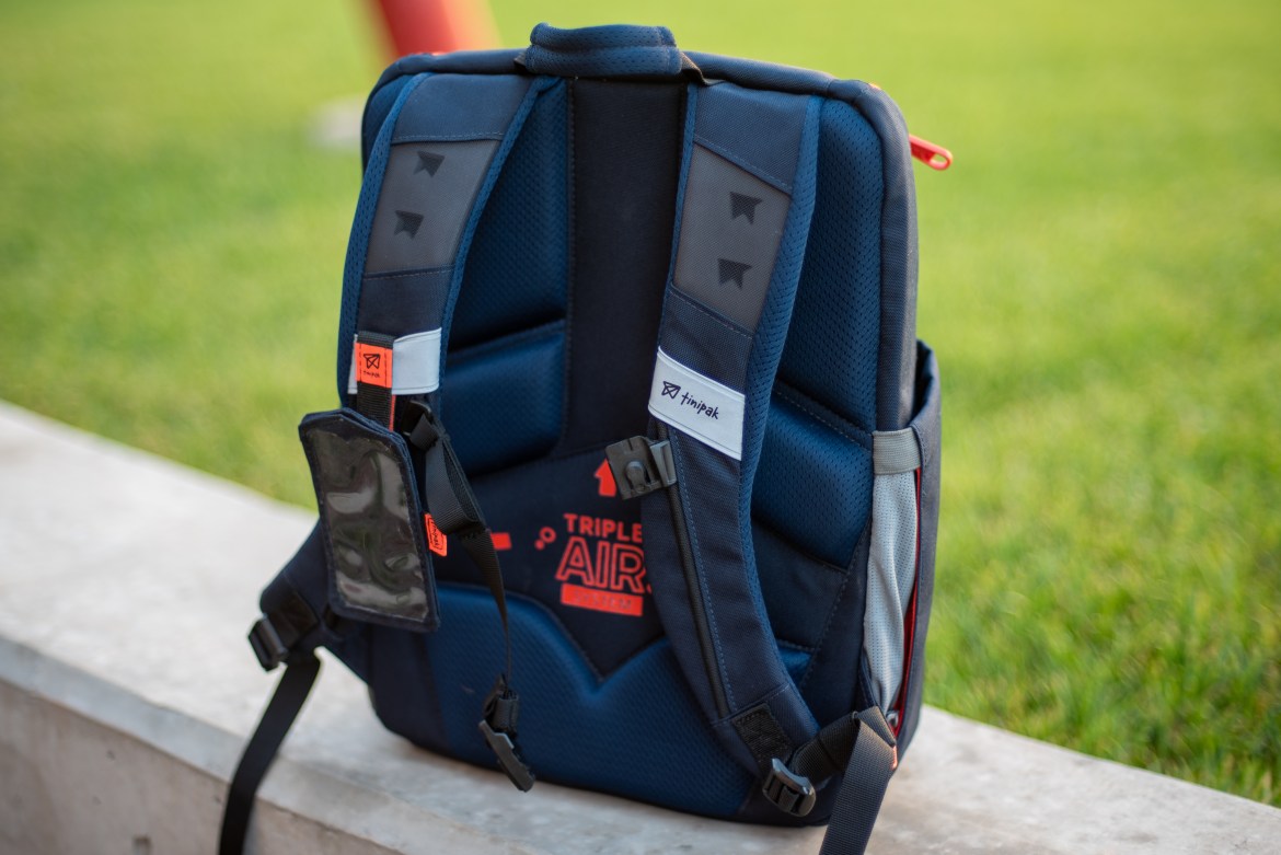 My 6 year old son carried the bag some and had no complaints about carry comfort either. The suspension of the TiniBox has raised padding covered with airmesh intended along with air channels to help airflow. For ease of use, Tinipak have used a Fidlock buckle on the sternum strap and their little I.D. card holder called, “TiniCard” affixed to a shoulder strap. There is more reflective material and a top carry handle as well.