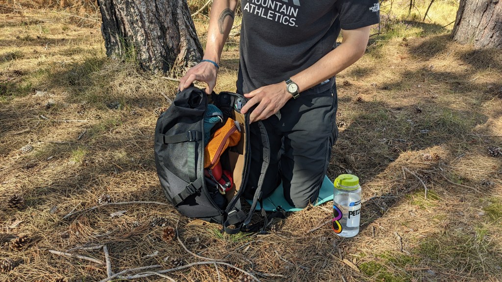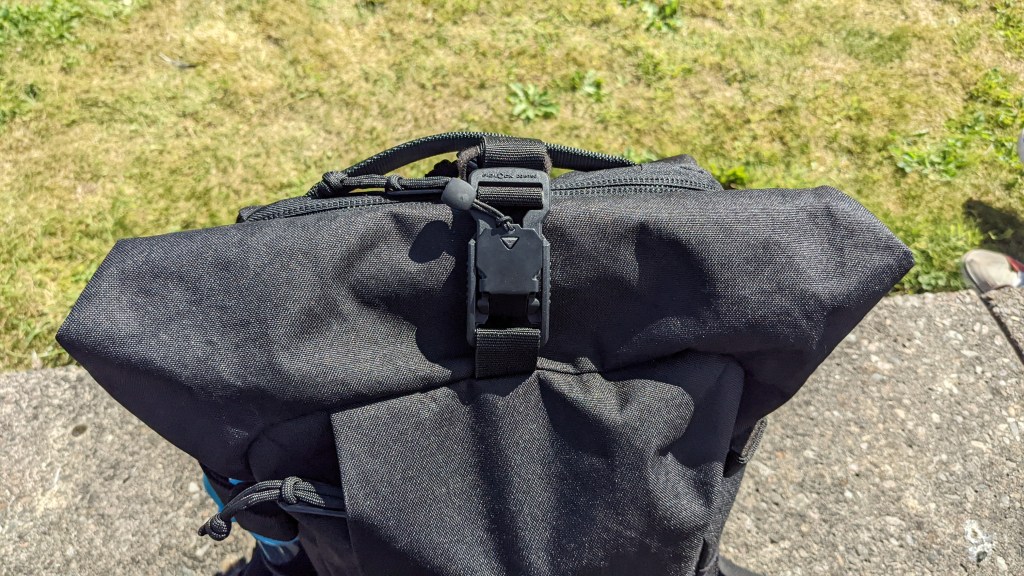 When it is needed, the top opens up into a kind of chimney, which tapers in a way that’s hard to see (like I said: ‘deceptively complex’) but works brilliantly. It never feels like it’s going to bulge outward as I tighten it up, and gone are the long side-straps of other hybrid rolltop designs. The single top strap closes with a Fidlock v-buckle, which is satisfying to use and, I think, well chosen in this case.