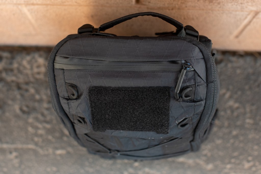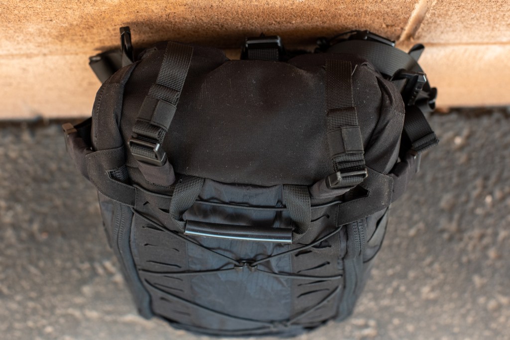 Looking down on the pack one notes a top pocket that holds something like a smart phone or keys and a rear carry handle.